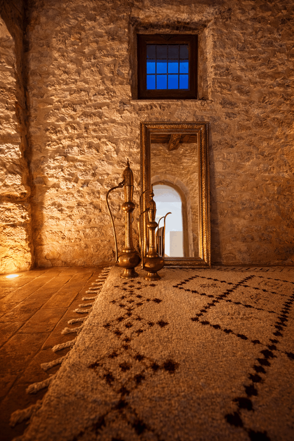 Posta al piano terra dell'edificio principale, attigua alla reception e alla sala comune. 60 mq totali divisi in tre ambienti. Piccolo soggiorno con un antichissimo camino privato in pietra, ambiente elegante con soffitto a volte a crociera. Camera da letto di circa 21 mq in una antica cella monastica, pavimento in cotto antico. Bagno privato di circa 20 mq con doccia, vasca alla francese, lavandini in ceramica marocchina fatti a mano. Un assoluto lusso per gli amanti del bello.